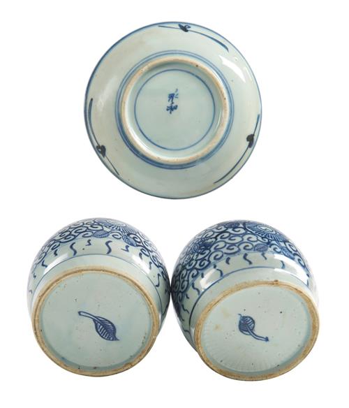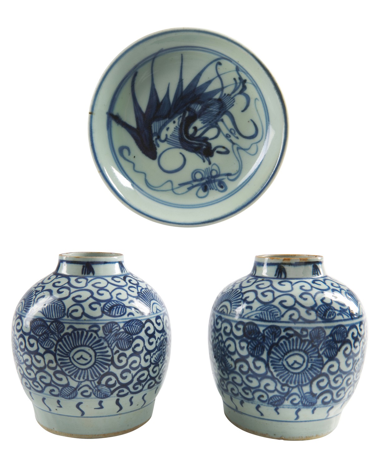The jars decorated with scrolling flowers and butterflies, the dish with a stylized phoenix and a two character mark to the base.