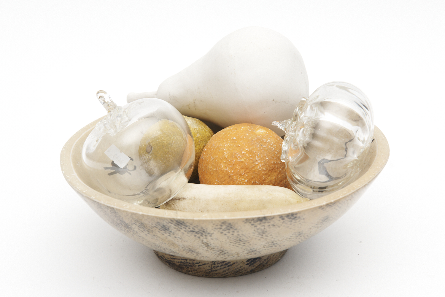 A STONE BOWL WITH FRUIT INCLUDING MARBLE AND GLASS