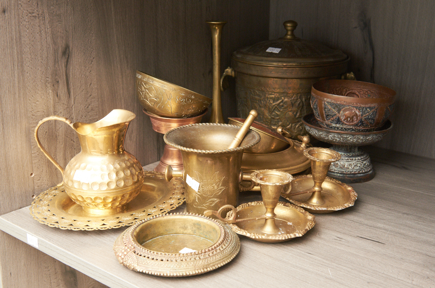 A PART SHELF OF COPPER AND BRASS INCLUDING MORTAR AND PESTLE