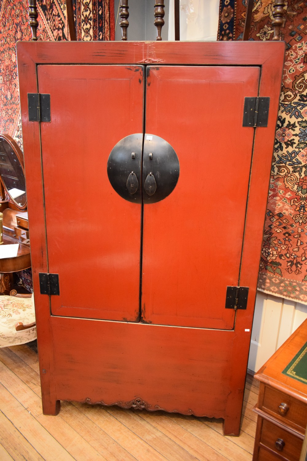 A CHINESE RED LACQUER TWO-DOOR CABINET (200H x 114W x 65D CM) (PLEASE NOTE THIS ITEM MUST BE REMOVED BY CLIENTS OR CARRIERS AT THE CUSTOMERS EXPENSE)