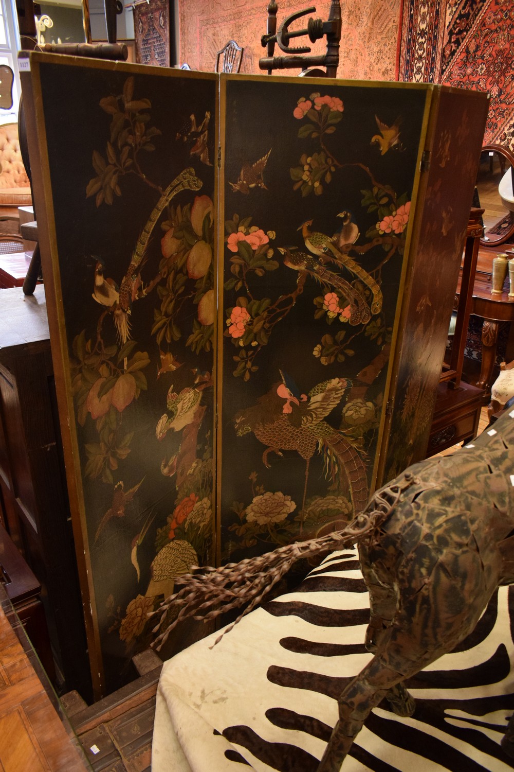 A DECORATIVE THREE PANEL SCREEN