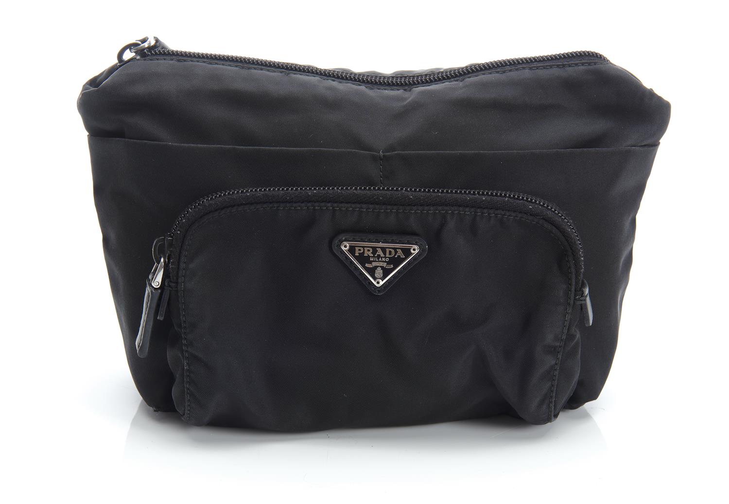 Styled in black nylon with silver metal hardware, 19 x 14 x 8cm.