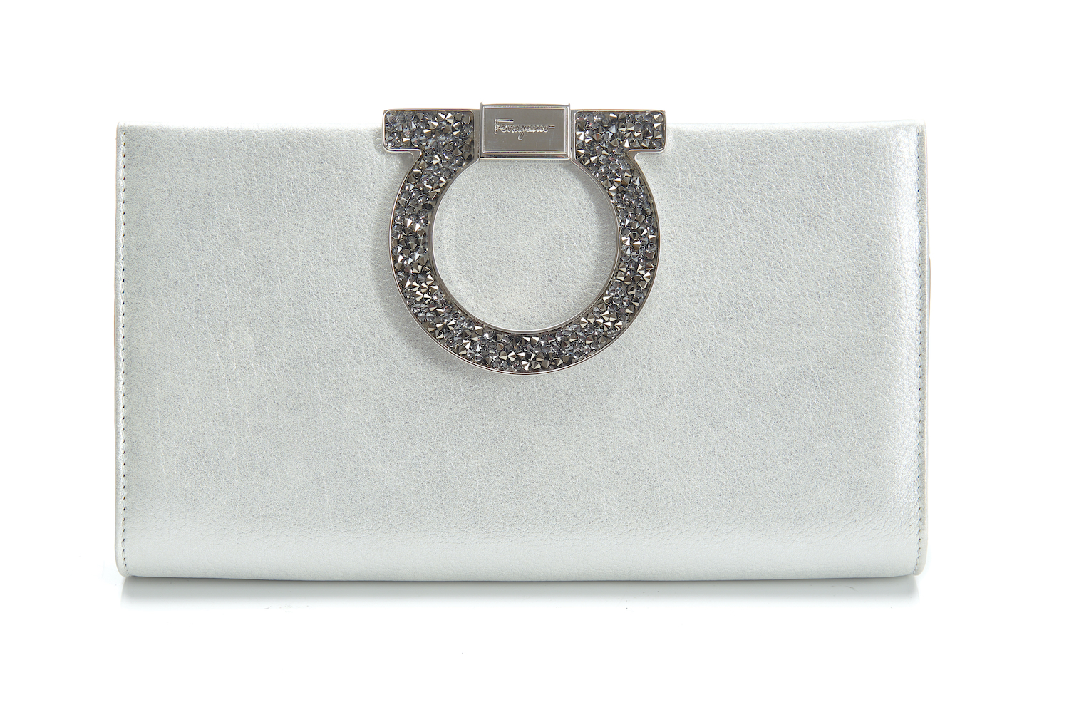 Styled in 'Perla' calf leather with gem-set Gancini clasp, optional chain shoulder;der strap, 21 x 12 x 4cm.