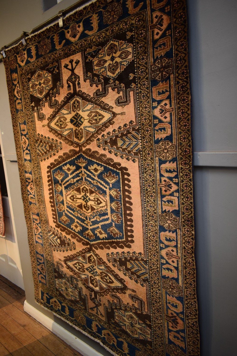 A VINTAGE PERSIAN VISS RUG. 100% WOOL. IN GOOD CONDITION. FULLY RESTORED FRINGES & SELVEDGES. BEAUTIFULLY MELLOWED COLOURS. HAND-KNOTTED VILLAGE WEAVE FROM THE ARAK REGION WITH TRIBAL DESIGN OF BOLD ANCHORED & STYLIZED MEDALLIONS, & QUARTERED CORNER MEDALLIONS IN AN OPEN FIELD. BORDER OF ROSETTES & TENDRILS. SIZE: 211X156CM ORIGIN: PERSIA - RRP: $2,600