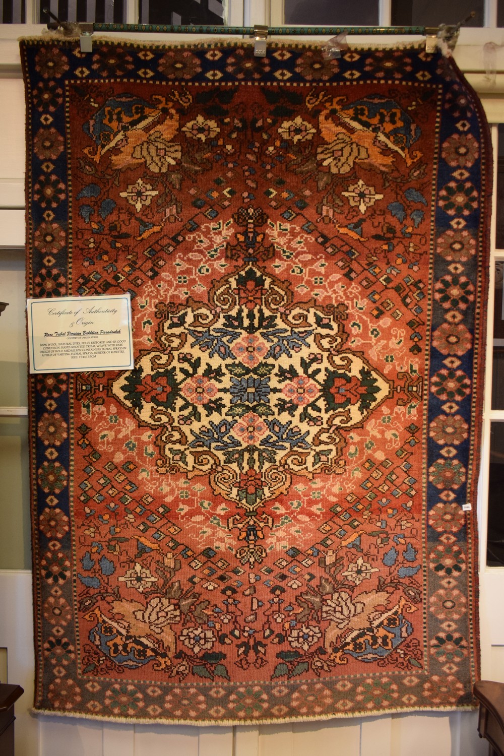 A RARE TRIBAL PERSIAN BAKHTIAR PARADONBEH. 100% WOOL. NATURAL DYES. FULLY RESTORED AND IN GOOD CONDITION. HAND-KNOTTED TRIBAL WEAVE WITH RARE DESIGN OF BOLD MEDALLION CONTAINING FLORAL SPRAYS IN A FIELD OF VARYING FLORAL SPRAYS. BORDER OF ROSETTES. SIZE: 194X135CM ORIGIN: PERSIA - RRP: $1,900