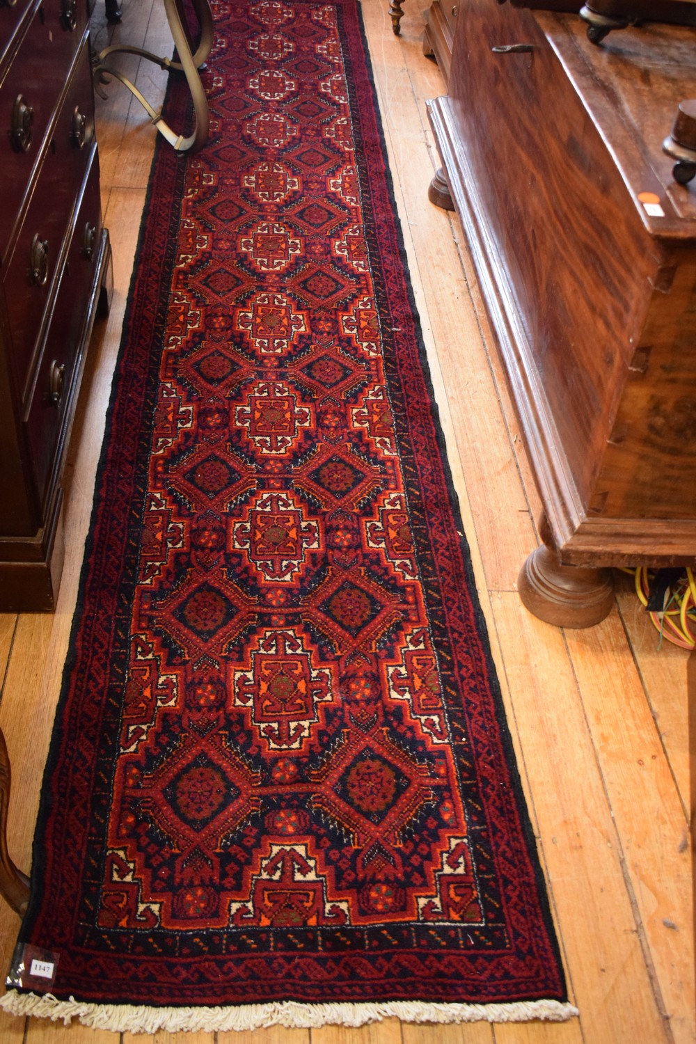 A TRIBAL PERSIAN BALOUCH HALL RUNNER. 100% WOOL. FINELY HAND-KNOTTED TRIBAL WEAVE WITH DESIGN OF ALL-OVER REPEATING MEDALLIONS CONTAINING FLORAL PATTERNS AND TRIBAL GUL MOTIFS. IN PRISTINE AS NEW CONDITION. SOLID & HARD-WEARING. SIZE: 374X63CM ORIGIN: PERSIA - RRP: $2,600