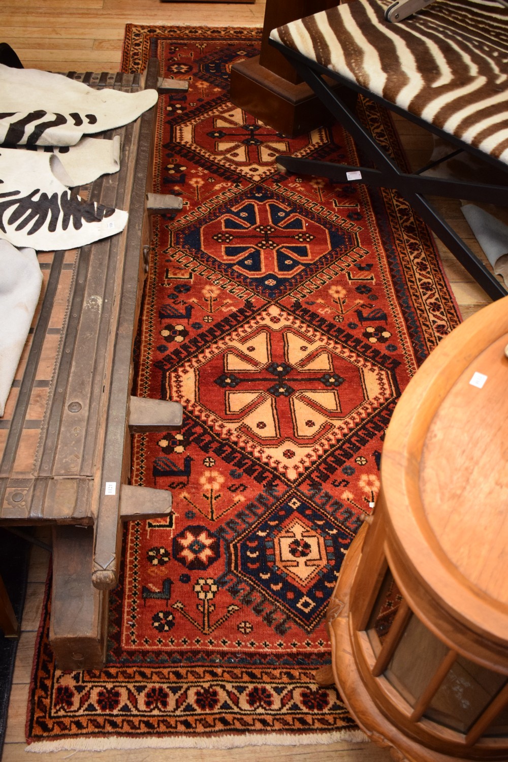 A TRIBAL PERSIAN QASHQAIE HALL RUNNER. 100% WOOL. DENSE PILE. IN EXCELLENT CONDITION. HAND-KNOTTED TRIBAL WEAVE FROM THE FARS PROVINCE WITH TRIBAL DESIGN OF REPEATING STYLIZED MEDALLIONS. SOLID AND HARD-WEARING. SIZE: 310X110CM ORIGIN: PERSIA - RRP: $2,800