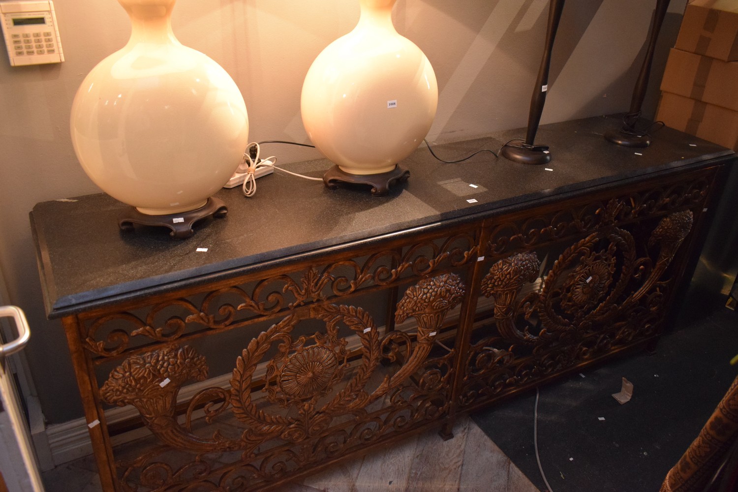 A FRENCH STYLE FORGED IRON SIDE TABLE WITH GRANITE TOP AND CORNUCOPIA MOTIF FASCIA PANELS (87H x 220W x 48D CM)