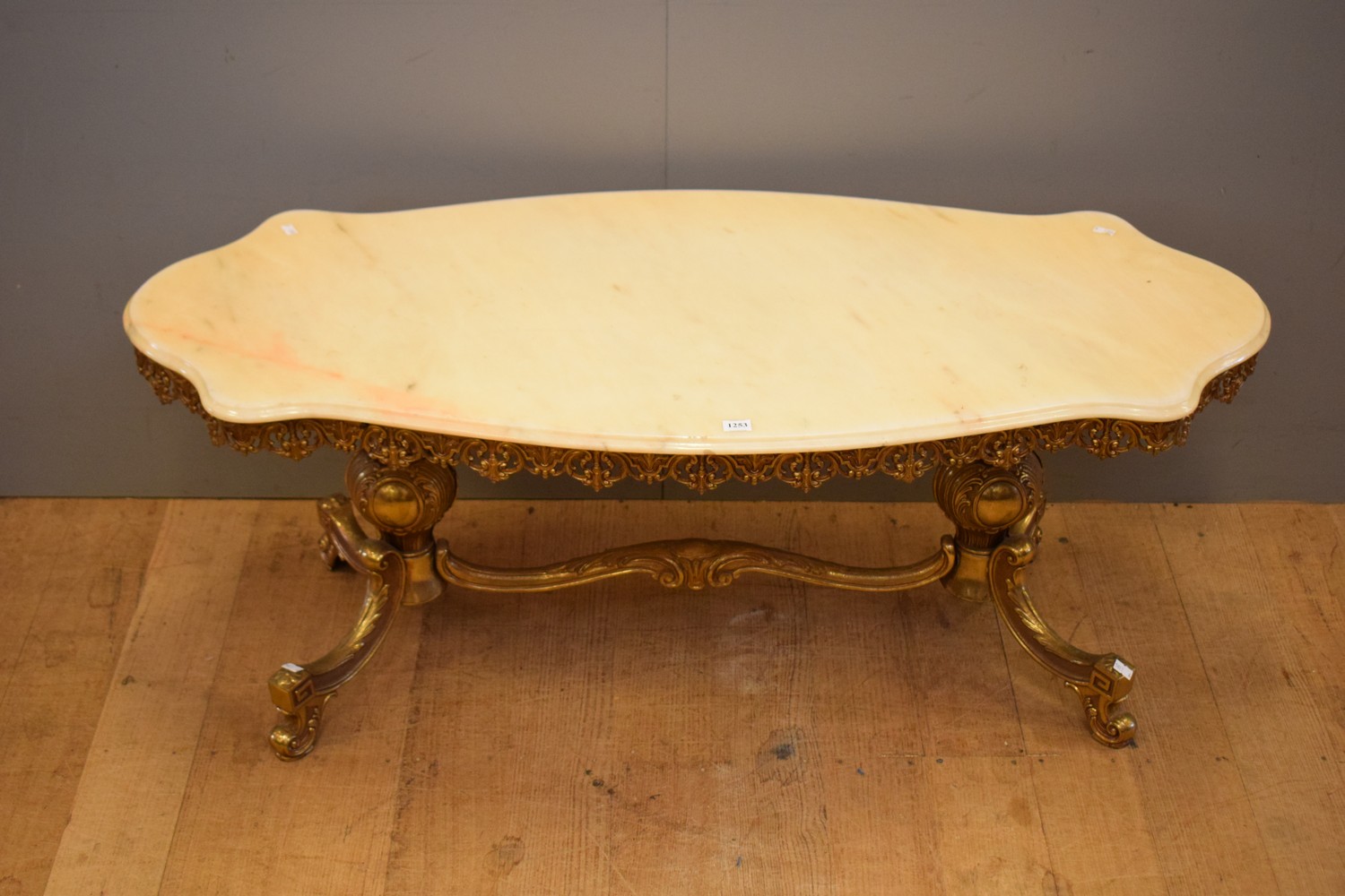A MARBLE TOPPED CLASSICAL STYLE COFFEE TABLE WITH GILT METAL BASE (45H X 113W X 50D)