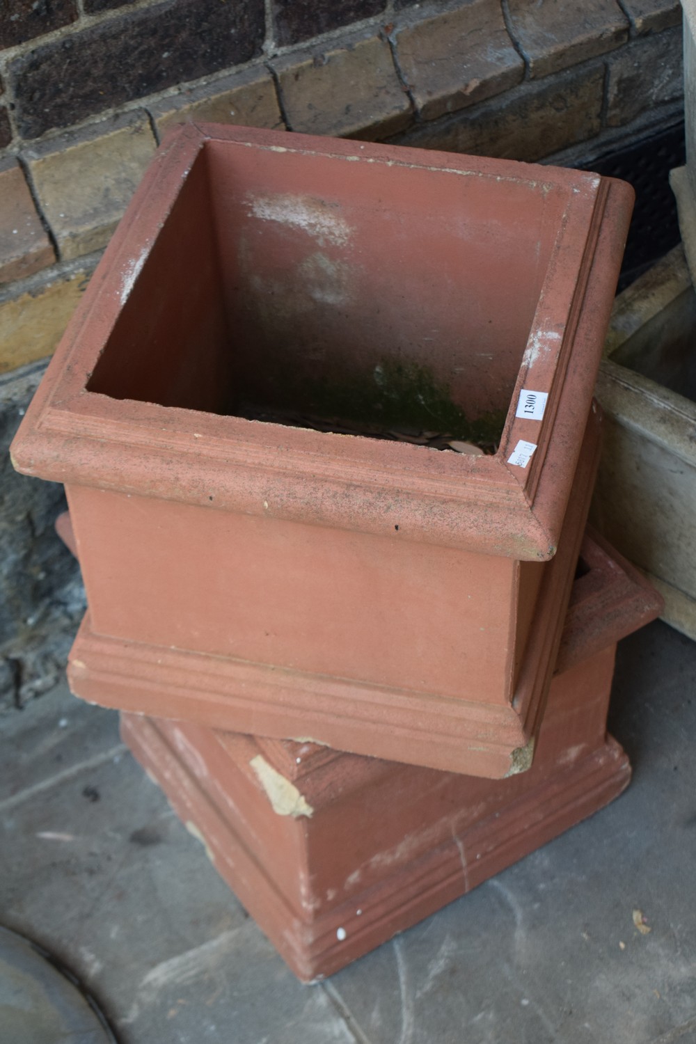 A PAIR OF CONCRETE SQUARE POTS (A/F) (PLEASE NOTE THIS ITEM MUST BE REMOVED BY CLIENTS OR CARRIERS AT THE CUSTOMERS EXPENSE)