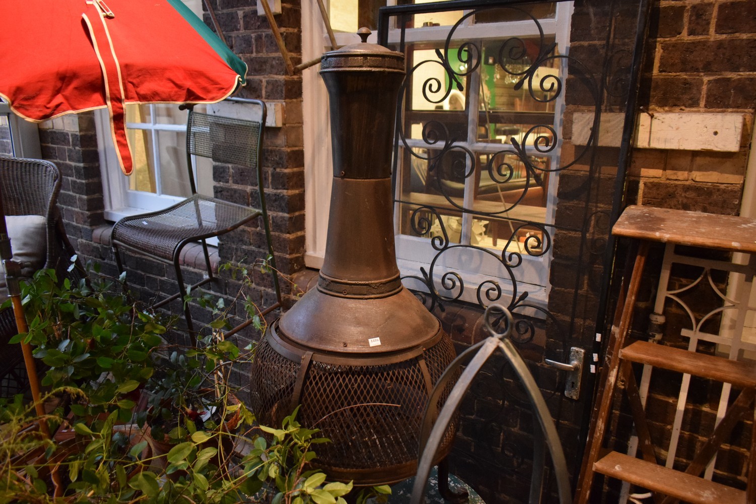 A LARGE CAST IRON AND METAL OUTDOOR CHIMINEA
