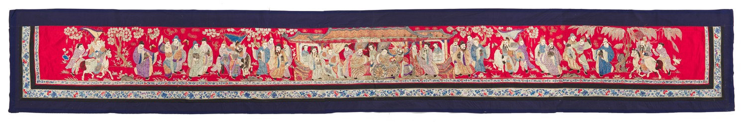 The red silk-ground embroidered panel depicting Taoist characters in a garden surrounding a pavillion, mounted later in an indigo cotton border.