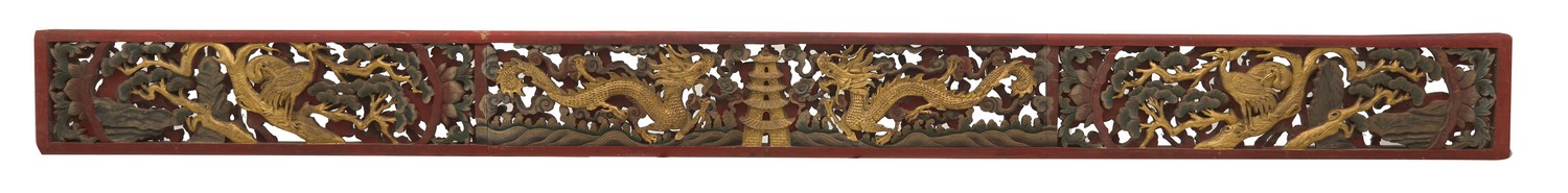 The long pierced and carved panel depicting dragons and clouds flanked by cranes in pine trees, decorated with polychrome and gilding.