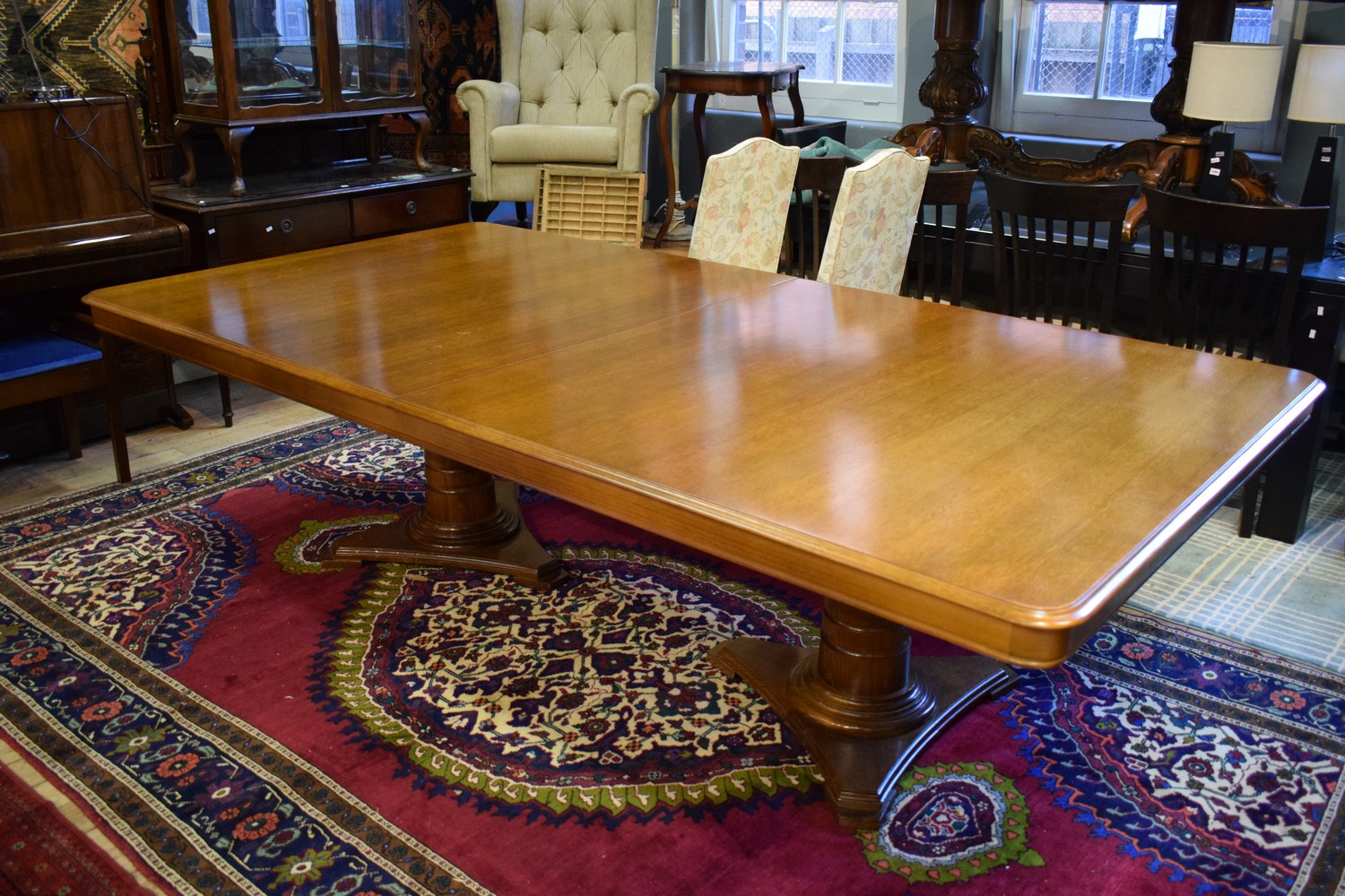 A VERY LARGE HARDWOOD EXTENSION DINING TABLE WITH ONE LEAF (75H x 320W x 137D CM) (PLEASE NOTE THIS ITEM MUST BE REMOVED BY CLIENTS OR CARRIERS AT THE CUSTOMERS EXPENSE)