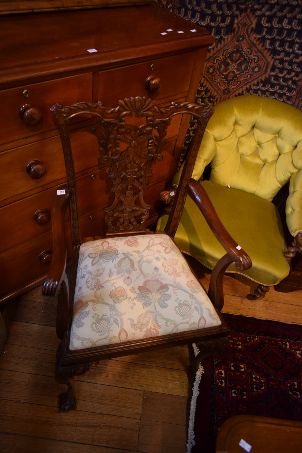 A PAIR OF DECORATIVELY CARVED UPHOLSTERED CARVERS