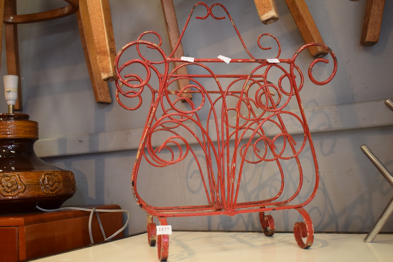 A MID-CENTURY DECORATIVE WIRE MAGAZINE RACK
