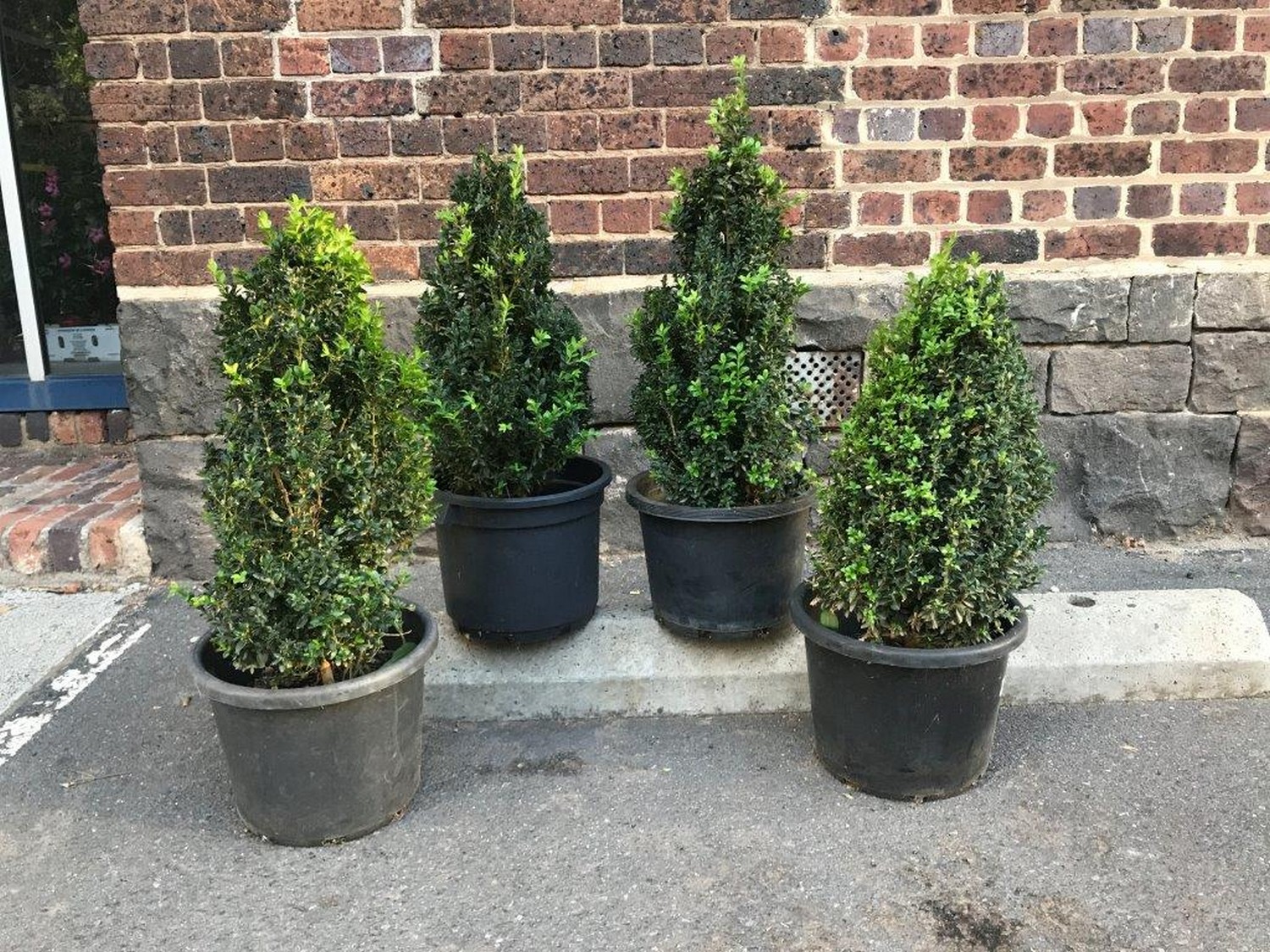 FOUR LARGE ENGLISH BOX CONE SHAPE TOPIARYS
