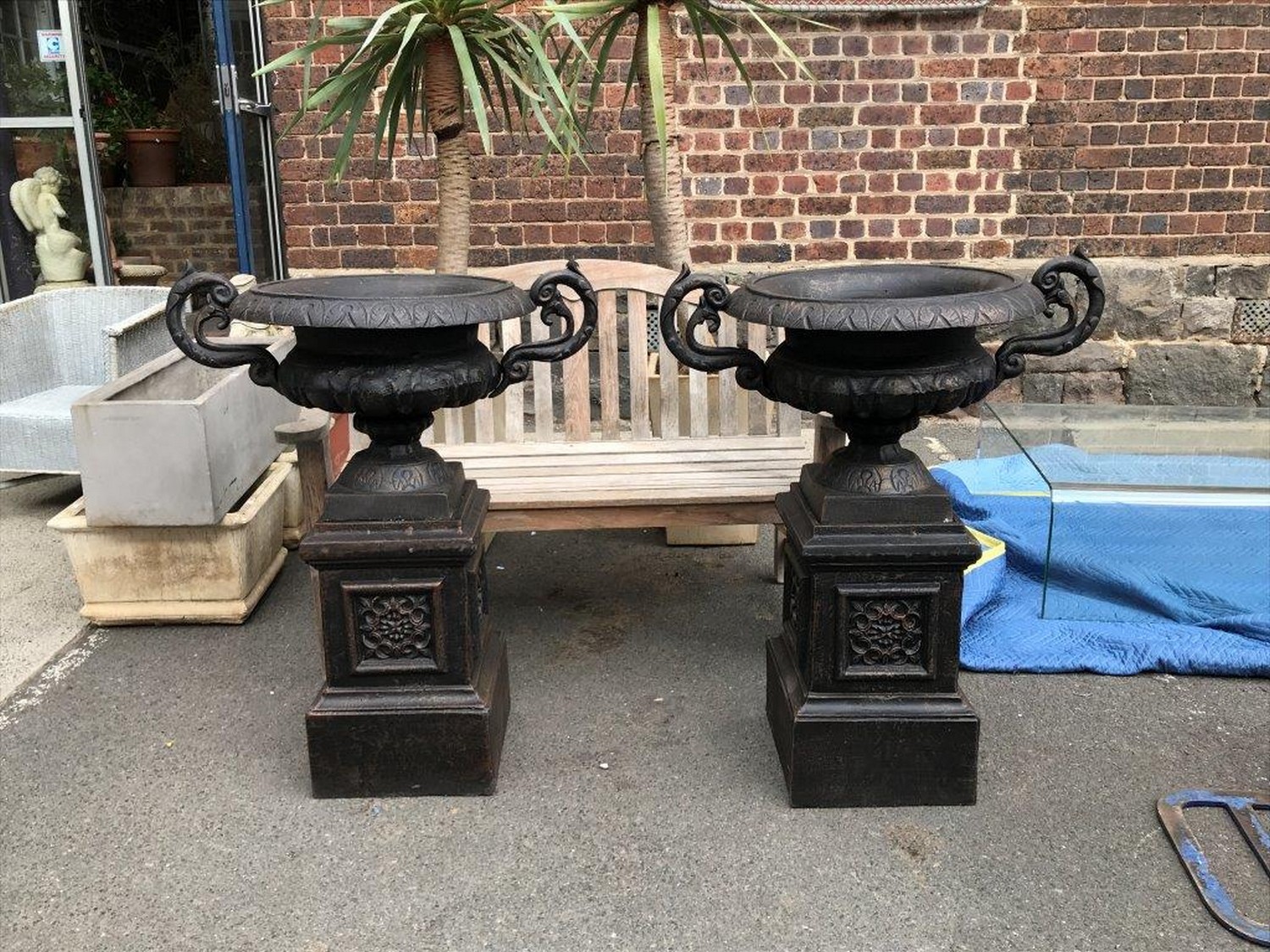 A PAIR OF ORNATE CAST IRON URNS (95H X 78W X 60D)