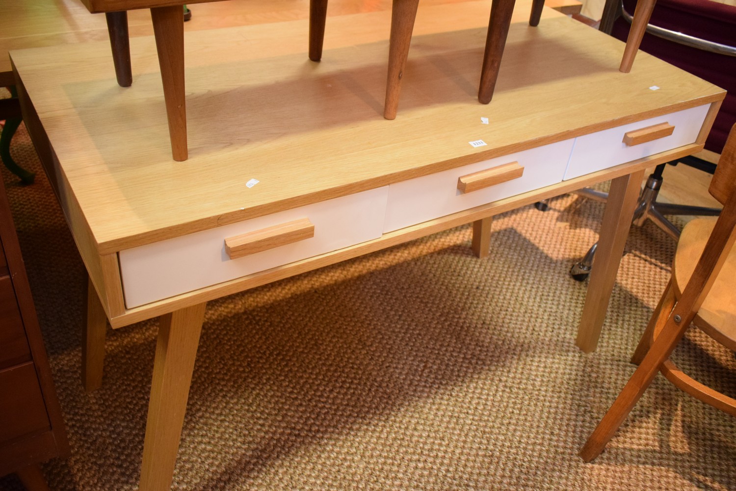 A MID-CENTURY STYLE THREE DRAWER DESK (77H x 120W x 60D CM)