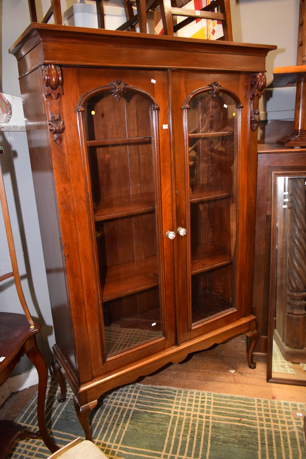A GLASS FRONTED DISPLAY CABINET WITH CABRIDLE LEGS (188H x 120W x 49D CM) (PLEASE NOTE THIS ITEM MUST BE REMOVED BY CLIENTS OR CARRIERS AT THE CUSTOMERS EXPENSE)