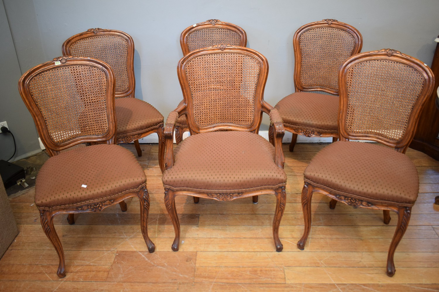 A SET OF SIX FRENCH STYLE RATTAN BACK DINING CHAIRS INCLUDING ONE CARVER (A/F STAINING TO FABRIC)
