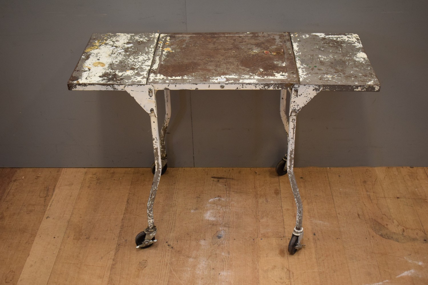 AN INDUSTRIAL FOLD DOWN TABLE ON WHEELS