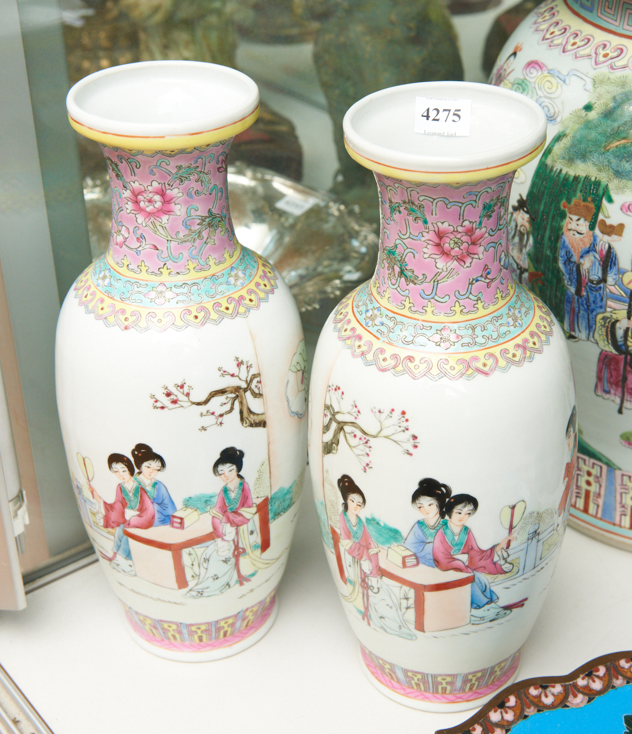A PAIR OF CHINESE ENAMELLED PORCELAIN VASES, 31 CM HIGH