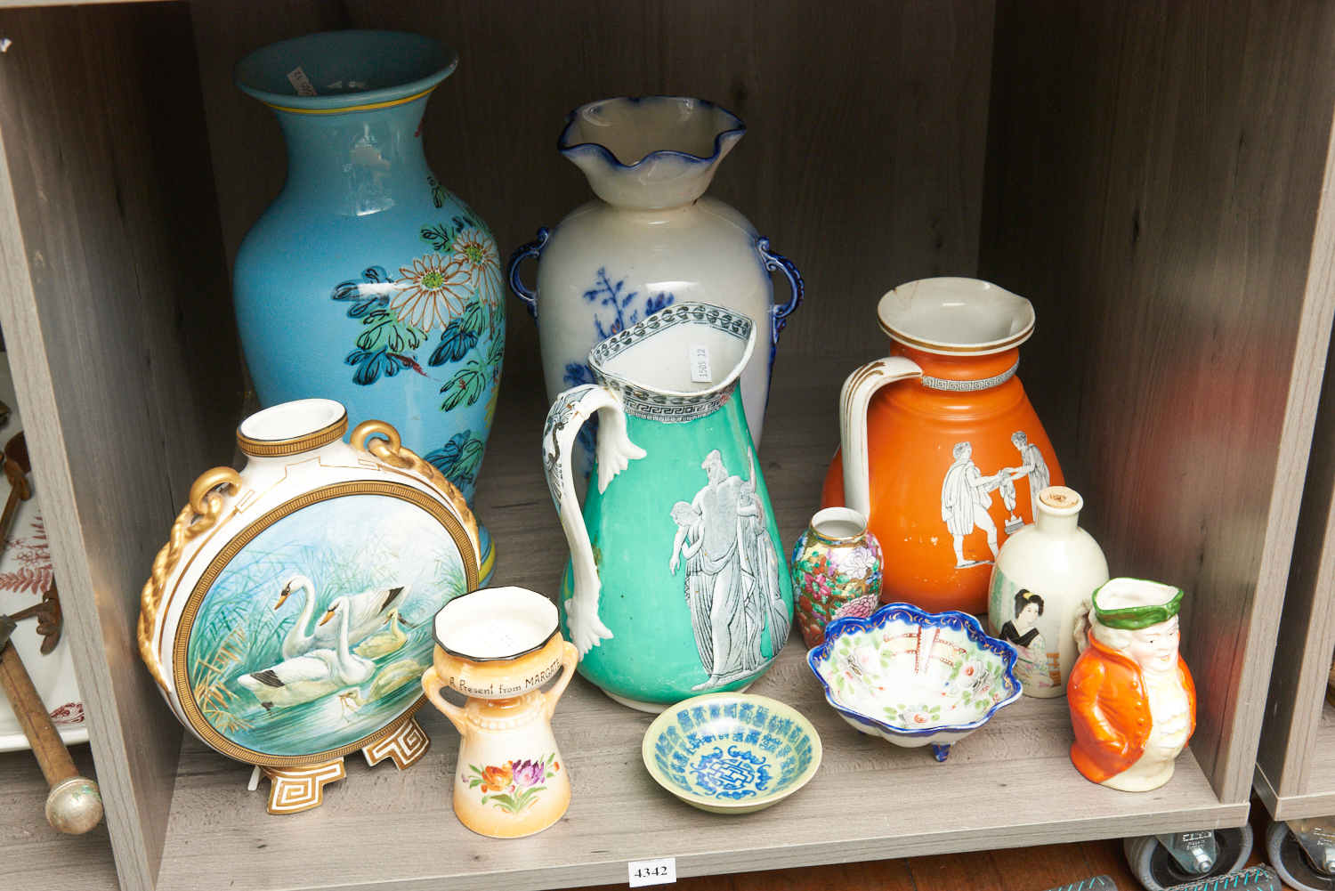 A SHELF OF VICTORIAN, EDWARDIAN AND ORIENTAL CERAMICS