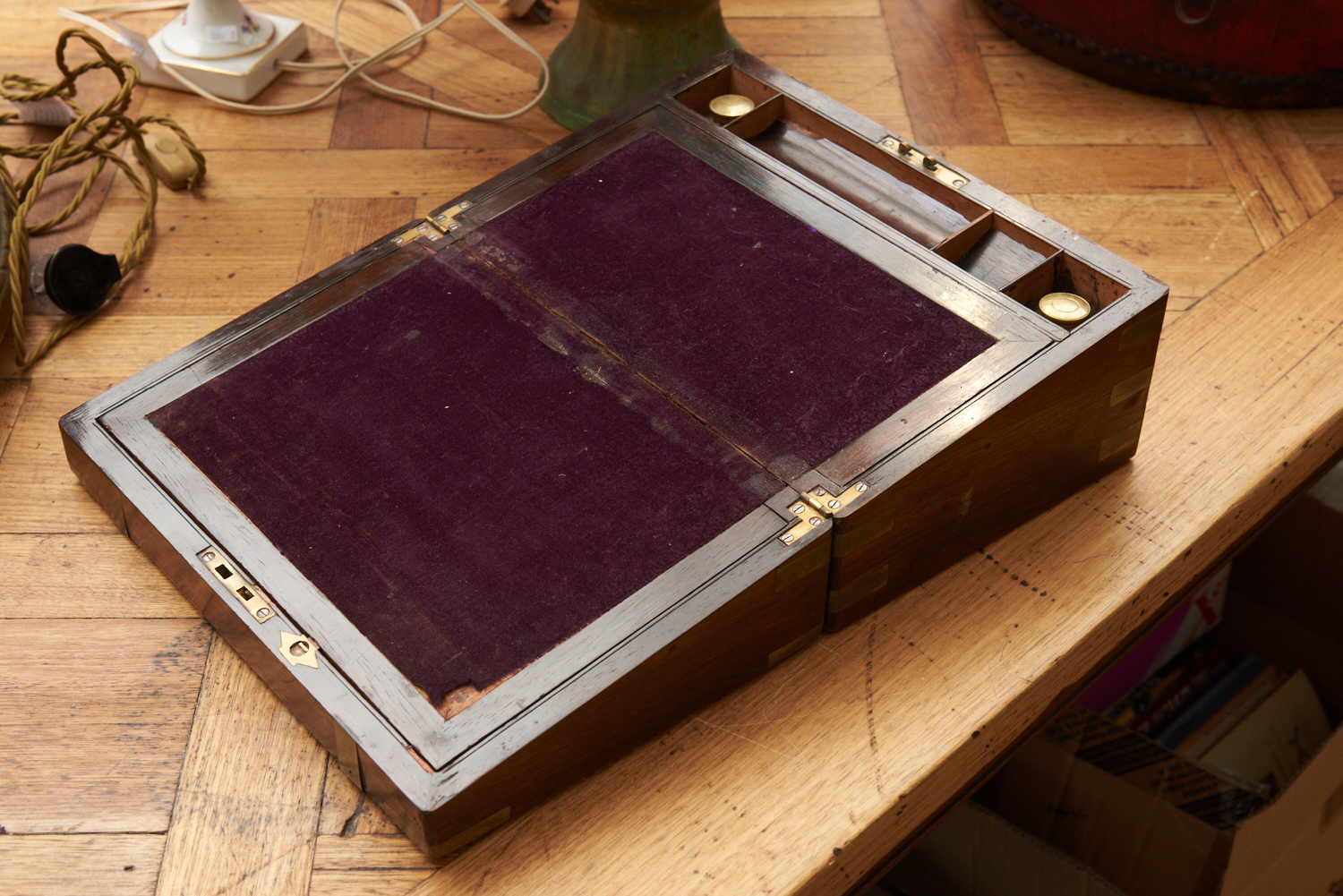 AN ANTIQUE WRITING SLOPE WITH INKWELLS AND VELVET INLAY WITH KEY