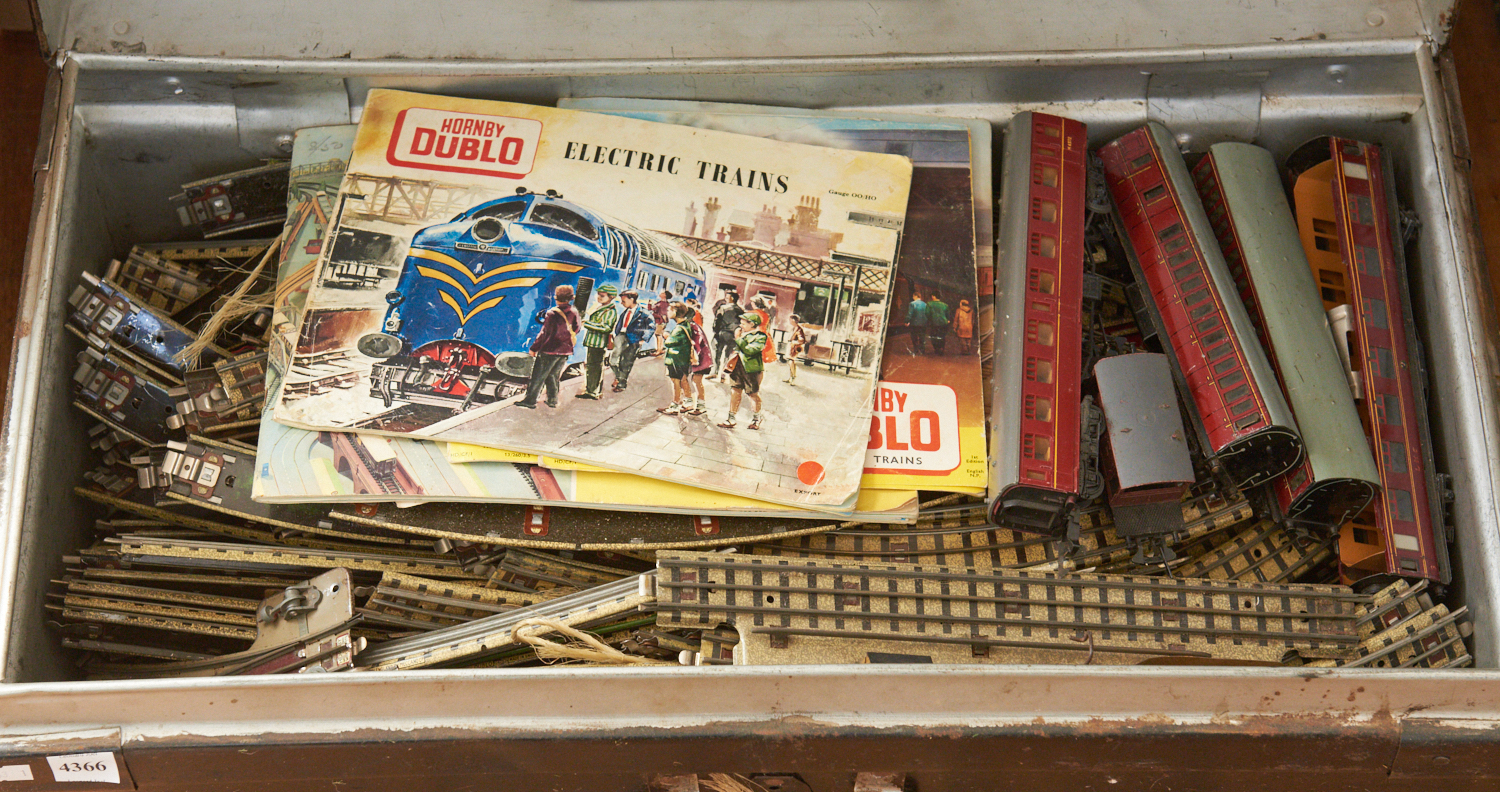 A VINTAGE METAL BOX CONTAINING ASSORTED TOY TRAIN ACCESSORIES (UNCHECKED) AND HORNBY DUBLO CATALOGUES