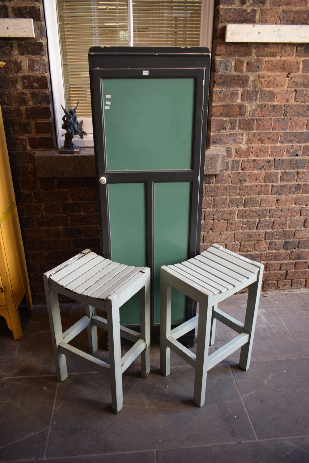 A RUSTIC PANTRY CABINET AND TWO STOOLS
