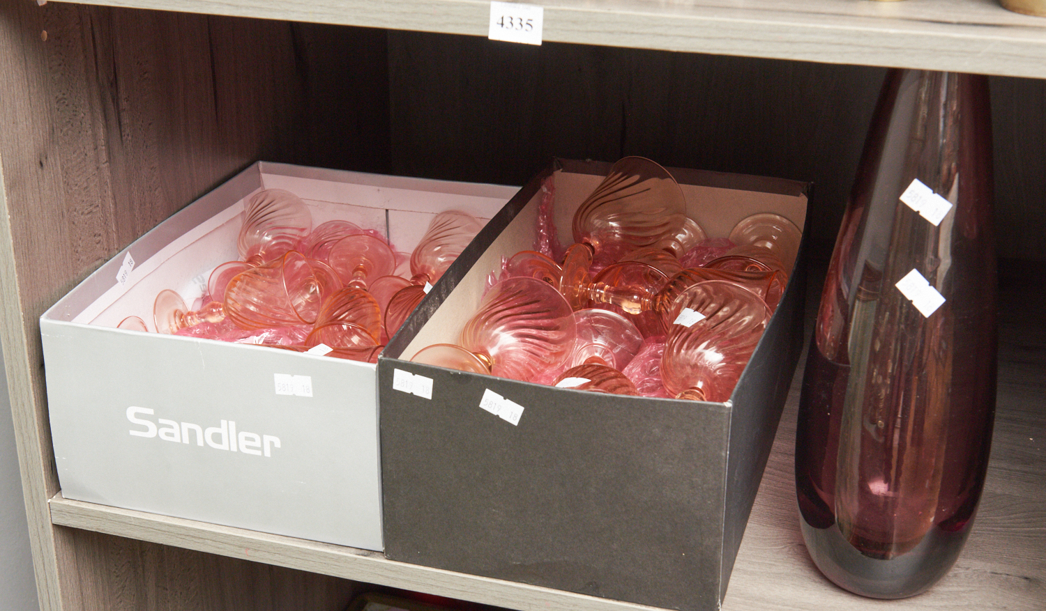 A SHELF LOT INCLUDING CRANBERRY GLASS STEMWARE AND A MURANO GLASS VASE