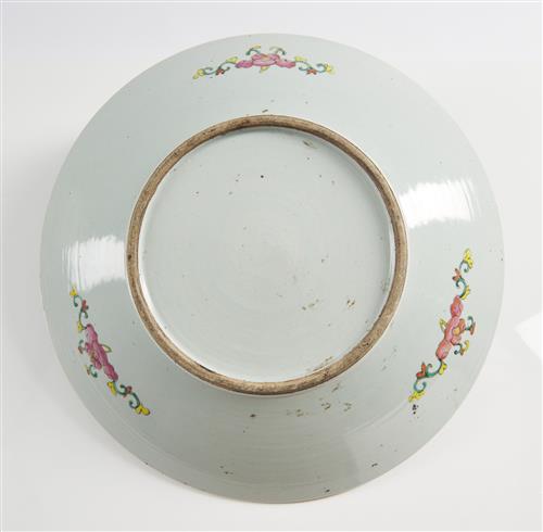 Some minor fritting to one three inch section of the rim. Significant overall wear to the enamels of the dish
