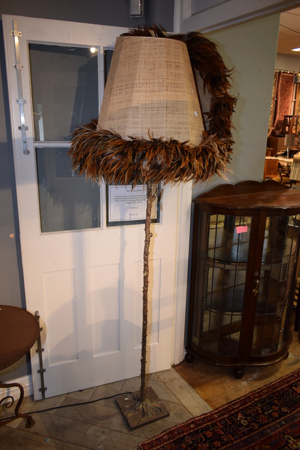 A LARGE RATTAN AND FEATHER LAMP WITH CAST IRON BASE BRASS