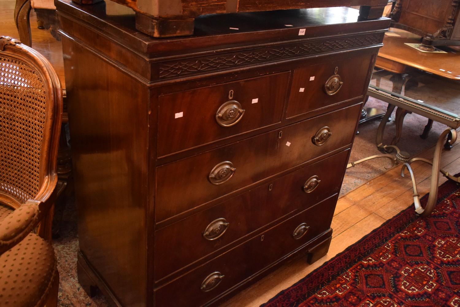 A FIVE DRAWER GEORGIAN MAHOGANY CHEST WITH CROSS BAND ON TOP (PLEASE NOTE THIS ITEM MUST BE REMOVED BY CLIENTS OR CARRIERS AT THE CUSTOMERS EXPENSE)