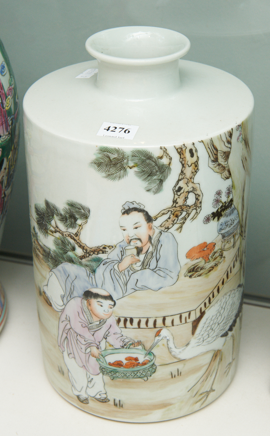 A CHINESE ENAMELLED PORCELAIN CYLINDRICAL VASE, 28.5 CM HIGH