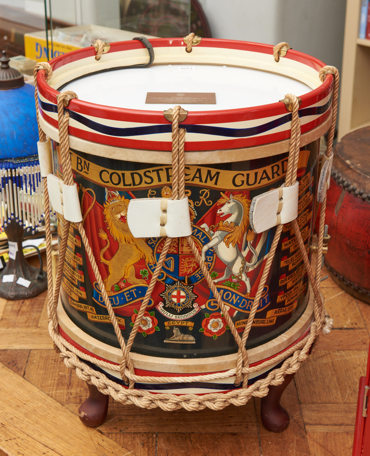 A PRESENTATION CEREMONIAL DRUM, WITH DEDICATION TO LIEUTENANT COLONEL I.H MCNEIL OBE, 49CM HIGH, 38CM DIAMETER