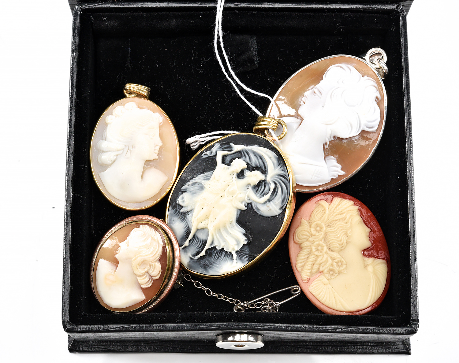 A COLLECTION OF FIVE CAMEO, SOME SET AS PENDANT OR BROOCH, IN SILVER AND/OR SILVER GILT