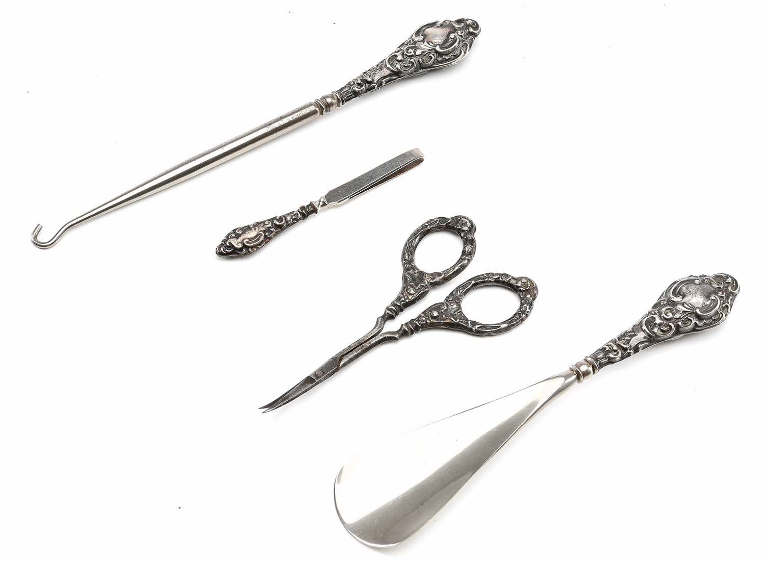 A VINTAGE SHOE HORN IN STEEL, TOGETHER WITH OTHER TOOLS