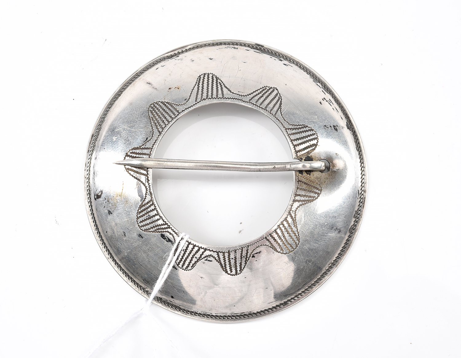 AN ANTIQUE GERMAN FIBULA BROOCH IN SILVER, HALLMARKED, 70MM ACROSS.