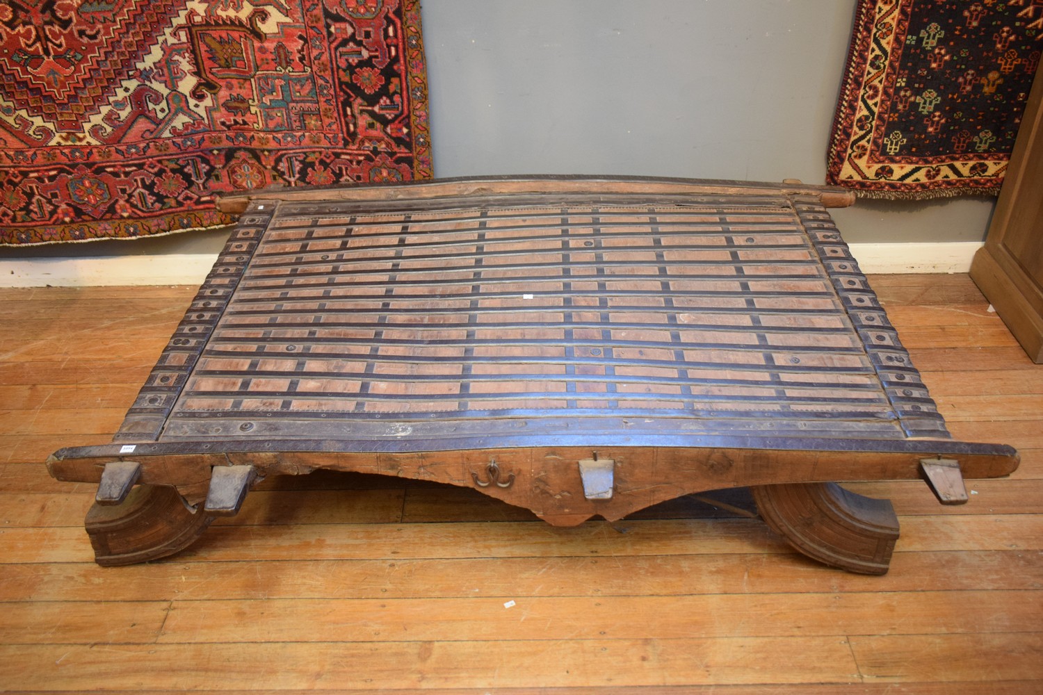 A SUBSTANTIAL CARVED TIMBER AND IRON COFFEE TABLE, ORIGIN INDIA (PLEASE NOTE THIS ITEM MUST BE REMOVED BY CLIENTS OR CARRIERS AT THE CUSTOMERS EXPENSE) (38H X 183W X 133D)