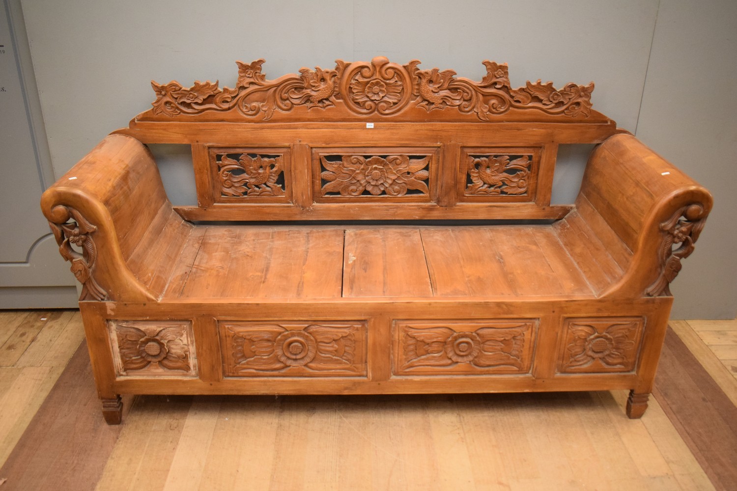 A SUBSTANTIAL CARVED BENCH SEAT WITH DOWRY CHEST (117H x 205W x 61D CM)