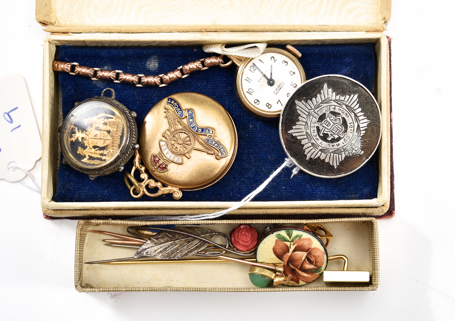 A COLLECTION OF ANTIQUE AND VINTAGE JEWELLERY INCLUDING A HORN BROOCH WITH THE ORDER OF THE GARTER MOTTO, HALLMARKED LONDON, 1916, TOGETHER WITH OTHER PENDANTS, TIE PINS AND A TASMAN MANUAL WATCH
