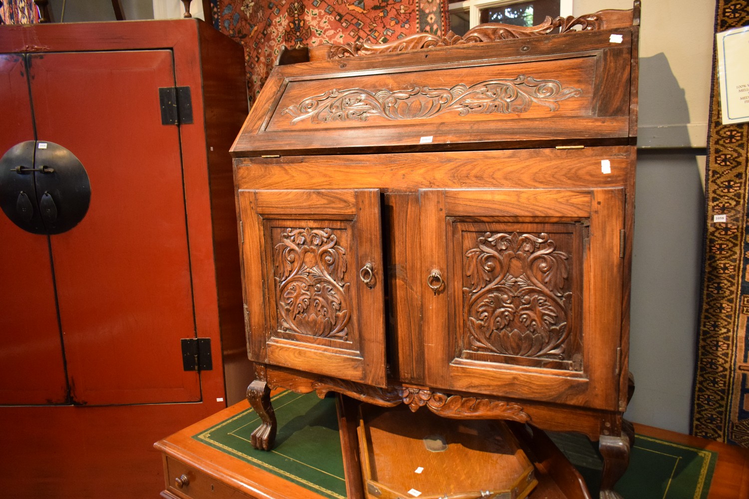A CARVED TIMBER WRITING DESK