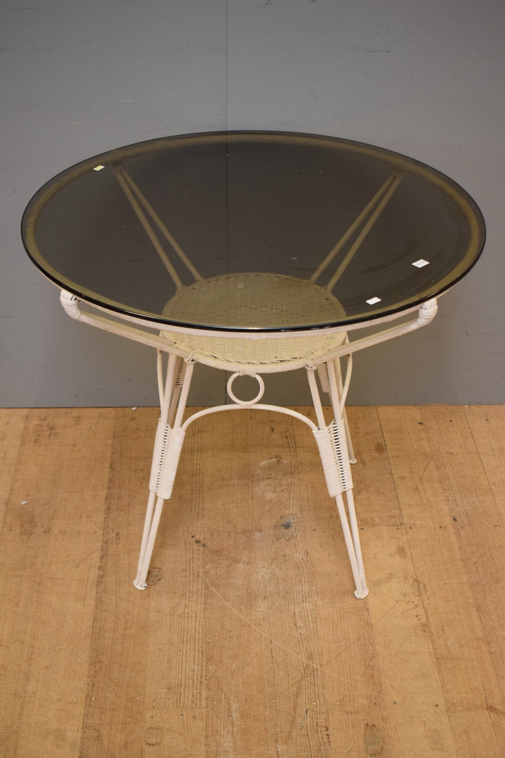 A GLASS TOPPED CANE AND METAL OUTDOOR TABLE