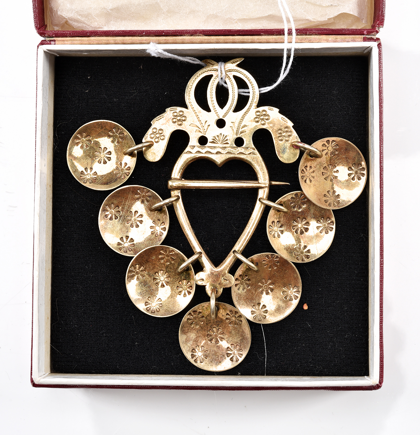 A VINTAGE FIBULA BROOCH WITH ENGRAVINGS, BOXED