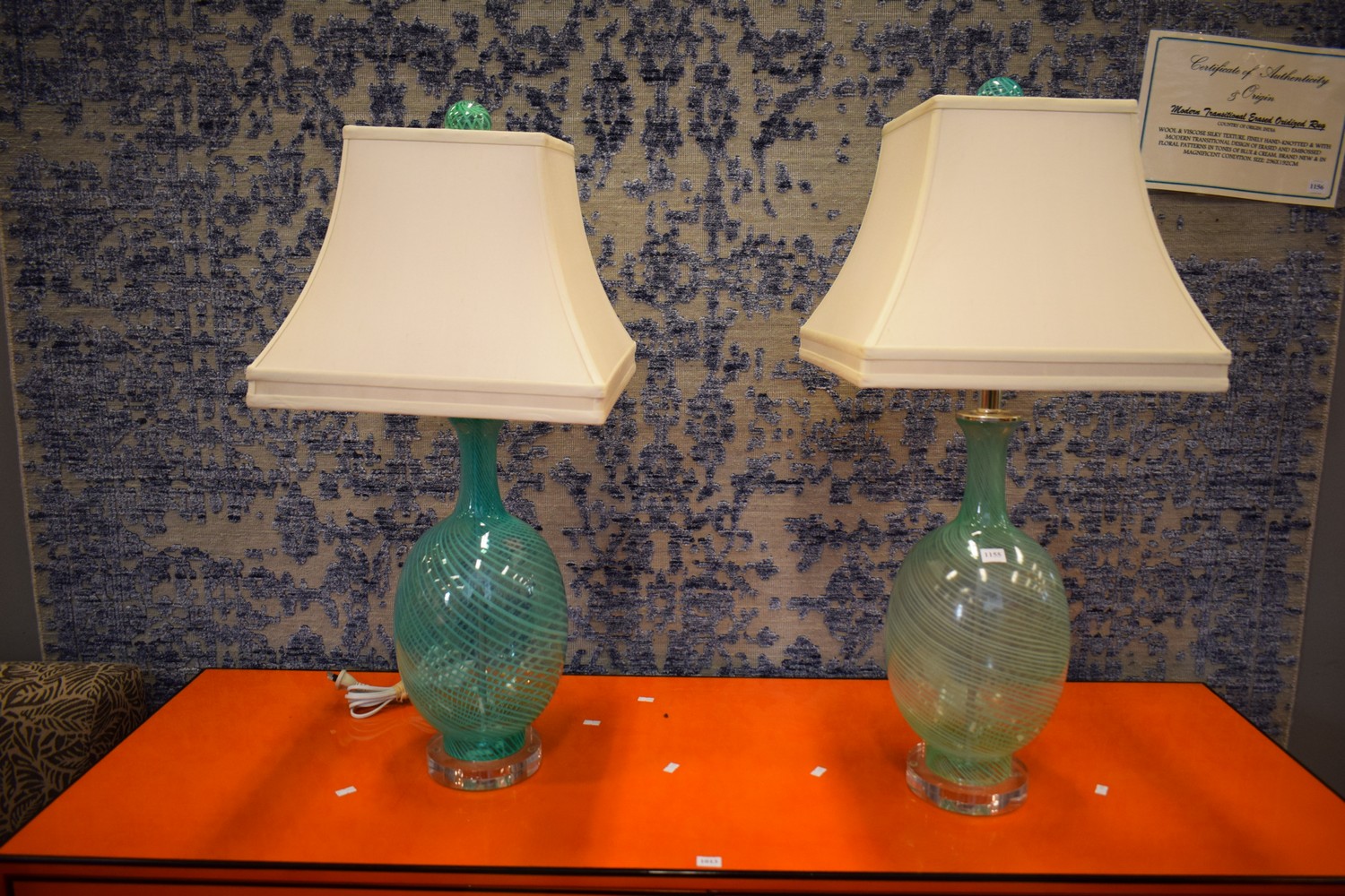 A PAIR OF TRANSPARENT AQUA GLASS LAMPS