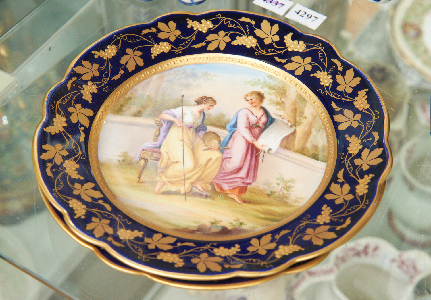 A PAIR OF VIENNA STYLE PORCELAIN PLATES PAINTED WITH SCENES DEPICTING LADIES AT LEISURE ACTIVITIES