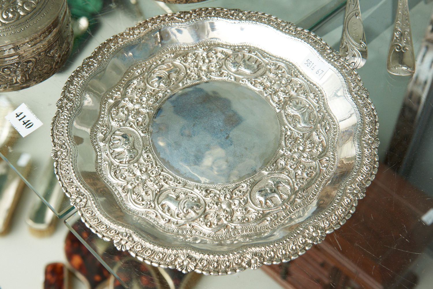 A SRI LANKAN SILVER PLATE, AN EMBOSSED LIDDED BOX AND A BOWL