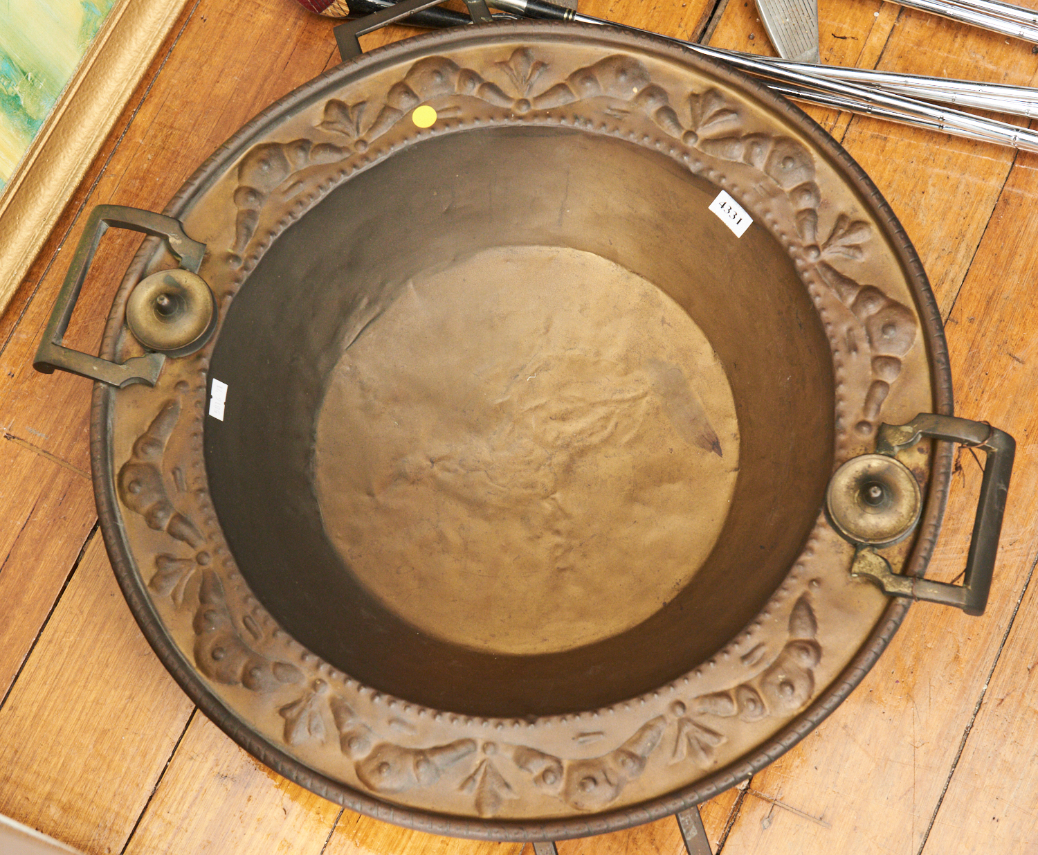 TWO COPPER AND BRASS PANS WITH HAMMERED AND EMBOSSED DECORATION, THE LARGEST 47 CM DIAMETER